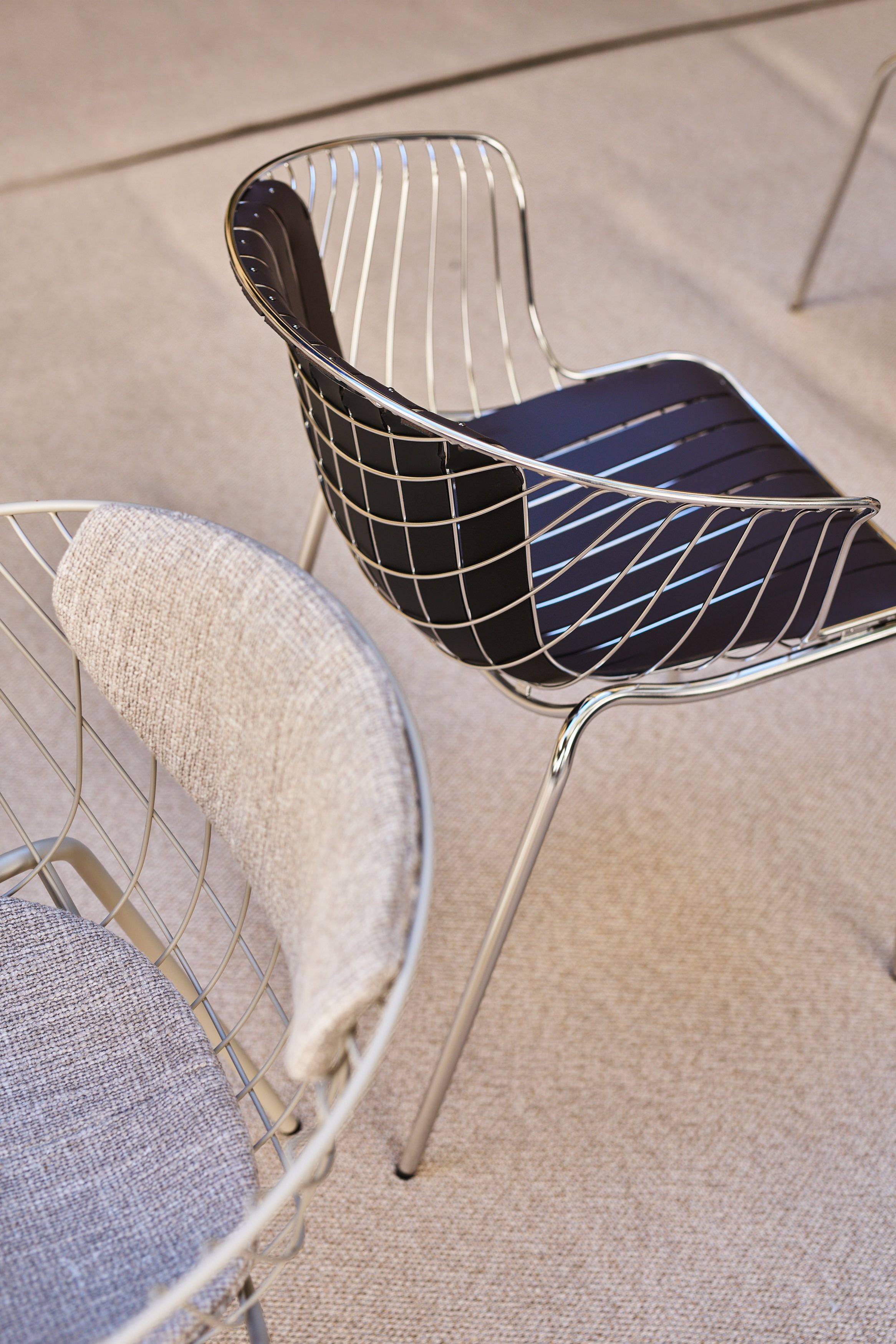 Aus dem Materialmix aus Leder und Stahl ergibt sich ein spannender und zugleich harmonischer Kontrast. Der Einsatz wird an das Gestell geknöpft, damit ist das Drahtgeflecht für den Sitzenden nicht mehr spürbar. Für die Oberseite stehen Saddle oder Paco Leder in verschiedenen Farben zur Wahl, die Unterseite ist immer schwarz gefärbt.